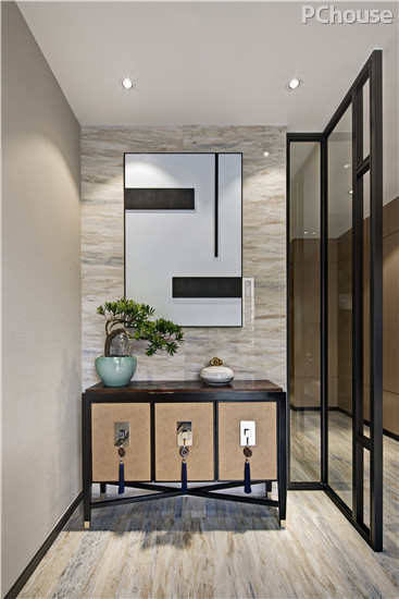 设计说明:储物间设计延续本案的东方雅致风格,地砖样式摒弃浮华与繁琐,反以洗练的线条勾勒出空间的灵动,而郁郁葱葱的绿松散发出怡然的气息,将生活形态和美学意识完美融合。