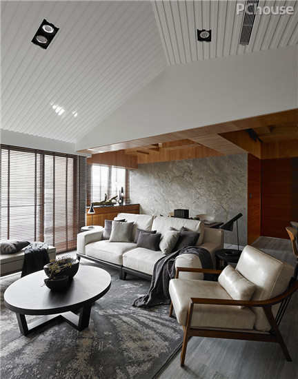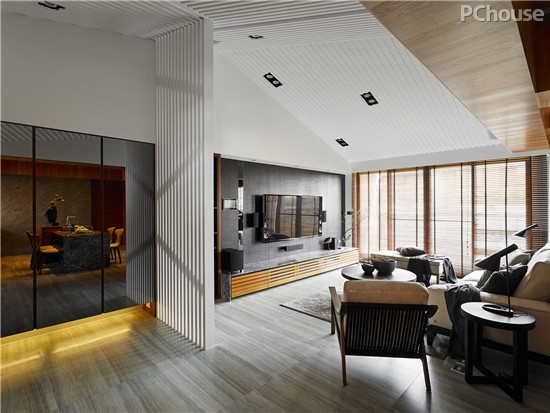 编辑点评:客厅中,设计师利用挑高的空间优势,设计出隔栅斜面屋顶,营造出更开阔的视觉感受;同时加入了块状量体的设计手法,巧妙地修饰梁体的线条。