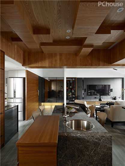 编辑点评:设计师以大面积的原木和大理石作为主线,营造了温润的质感空间。错落的天花设计,于稳重中增添了跳跃的立体感,整体的规划给人以轻盈自然的感觉。