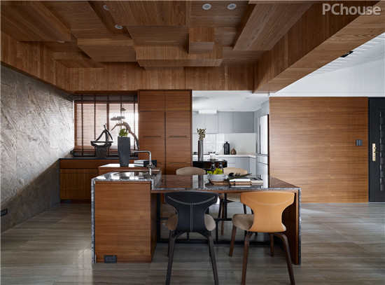 编辑点评:与天花板无比契合的岛台、餐桌以及墙体柜面设计,在视觉上创造了连贯性与延续性。那种自然和放松,仿佛是从天花延伸到地面,再发散到家居的其他角落,并让机能沿着动线的发展而呈现。