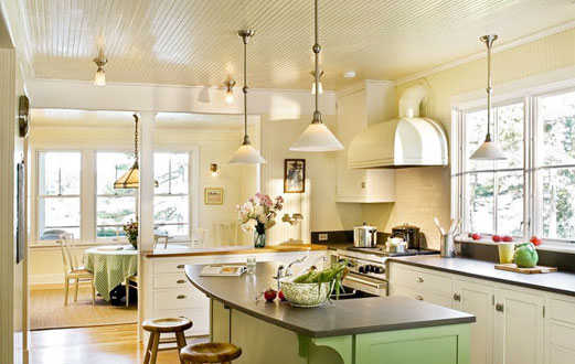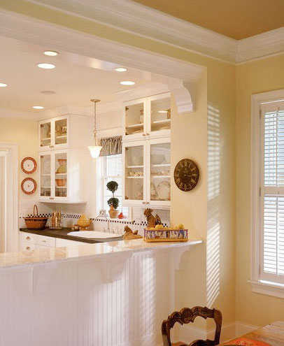 小编点评:厨房田园风格的厨房和餐厅,淡黄色和白色搭配出清新、雅致的空间氛围。厨房采用开放式,和餐厅之间用简易吧台进行隔断处理,半墙高的隔板式吧台是很好的喝酒、聊天、私话去处。
