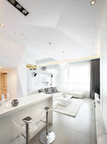 小编点评:若是家里实在没有角落打造小酒吧,像案例中这样,也不失为一种聪明的方法,整个吧台占不到一平米空间,一块白色简易桌子,很好的充当了过道的隔断,同时够长的表面还是很好的吧台空间。