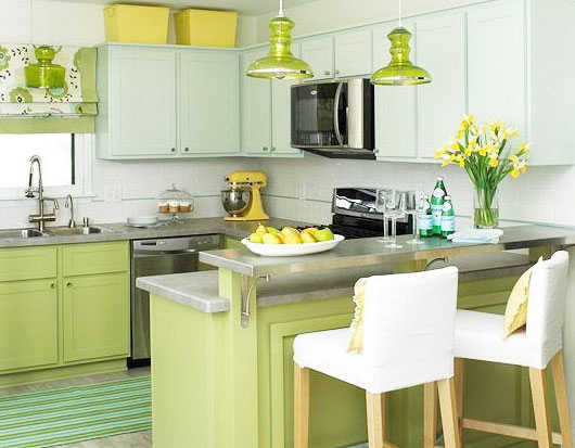 小编点评:金属质感的台面搭配田园绿色柜体,自然相得益彰,且收拾打理也方便至极。L行橱柜于转角处做了桥面延伸,同样材质的柜体,很自然的和吧台所在柜子连成一体,构成这个可做小餐桌又是小吧台。