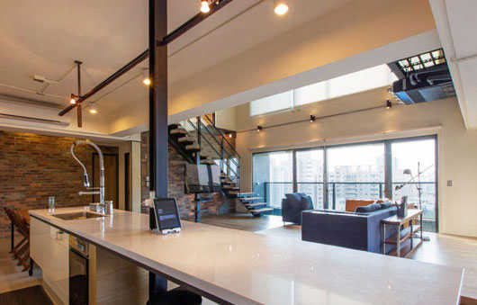 小编点评:厨房和客厅同处一室,厨房部分操作台面位于屋子中央,房柱从中间穿过。操作台面无限向外延伸,所以就给吧台提供了充足的活动空间。