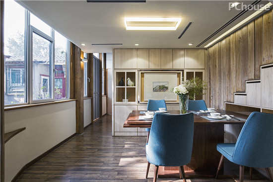 和主卧对称的东侧是餐厅,同样是老榆木的百叶隔断与卧室呼应。利用多功能柜的旋转轴,电视可以同时供客厅餐厅使用。
