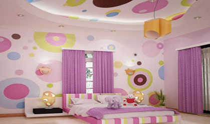紫粉色的窗帘和大小不规则的五颜六色的圆圈做为房间的背景以及天花板,这些都有让人处在梦幻般的童话世界之中的错觉。屋顶橘黄色的吊灯给房间在梦幻之中加上了暖暖的温馨感。