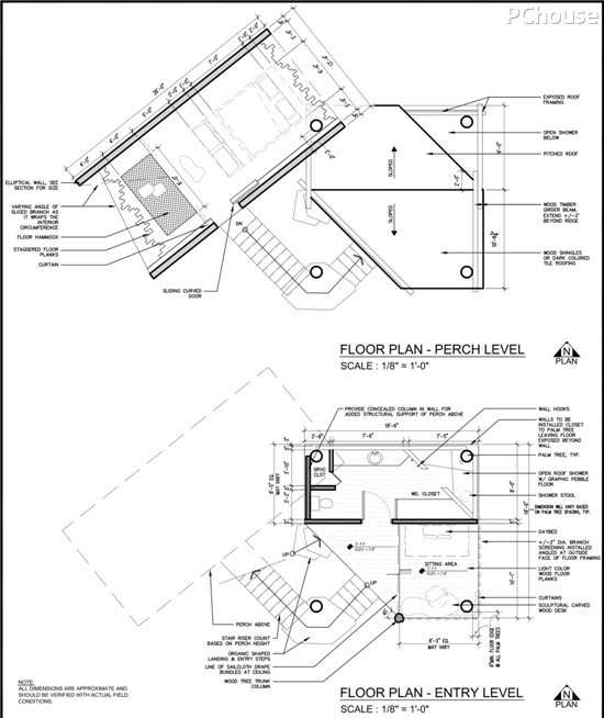 设计说明:室内和室外的竹笋是该高处栖息处向外伸展的枝丫。就地取材的木材构成其地板边缘,天花板及墙壁,它们都是在大自然中发掘的元素的随机组合。
