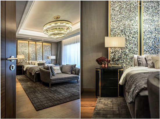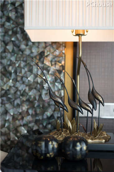 设计说明:主卧室专属定制床头屏风运用黑色哑光漆的高质木材,金箔饰面与金箔做旧金属边为底框,大面积特殊贝壳贴片成幅,独具一格,手工灯罩造型独特,点睛现代东方美学。