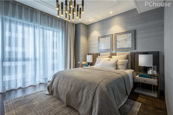 设计说明:次卧以素雅的白营造静中之境,剔除杂琐碎的装饰,特殊定制的床头与边柜形成呼应,简洁的形式、柔和的线条,清寂的花艺,共同营造一种超凡脱俗的美。