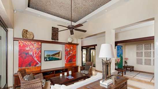 跟前一款是同类型的背景墙打造,将电视机藏在背景墙里面,需要的时候拉开隔栅,日常休憩的时候就收起来,随性灵活的家居氛围。空间整体风格偏泰式,在背景墙色彩的把控上也以木色为主。
