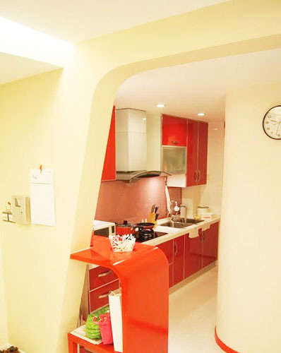 小编的话:厨房想要大面积的红色一般比较困难,毕竟是要吃饭烹饪的地方,本来就比较油烟浓重,如果再弄成热烈的红色,会让人感到烦躁。所以墙面还是采用纯粹的白色要好点,橱柜就能选择浓烈一点的色调了。而墙边的小吧台也可以设计成红色,既是很好的隔断也是不错的情调。