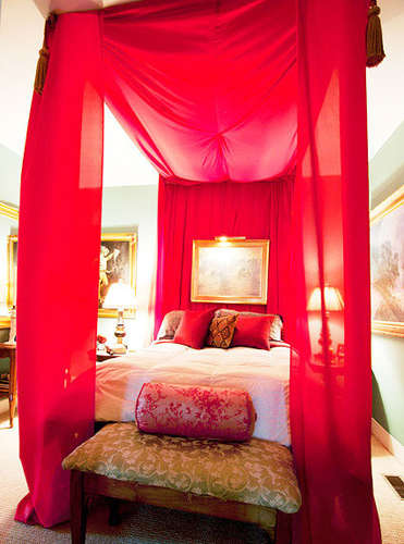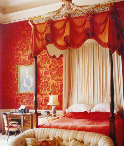 小编的话:整个房间充满典雅气息,所以床头帷幔以及背景墙在上色时要偏向稳重一点的暗红色,花纹壁纸和床架上方王室范的装饰都让卧室空间变身气质极佳的公主系。