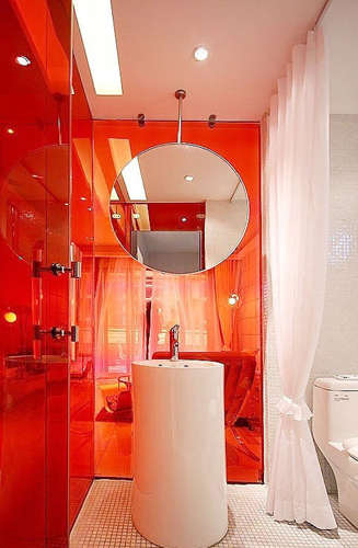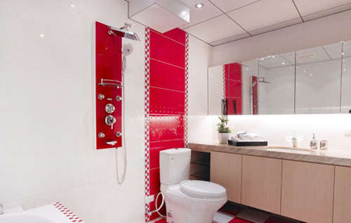 小编的话:卫浴中肯定会有镜子的存在,随意想要营造温馨和热情感,并不一定要将整个卫浴都装成红色,不妨在镜子对面设计一面红色墙面,这样镜子就能将其反射出来,能在白色的卫浴间中渲染出更多的红色,产生新房所需要的感觉。