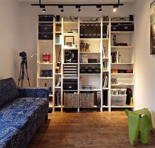 小编的话:对于宅男来说,除了必备的电脑之外,这样的一个读书区域想必也是不可或缺的吧?大容量的收纳书架可以满足房主平日收纳书籍以及零零落落小物件的需求,在房间中再摆上一张舒适的小沙发就能够在这边进行阅读咯。