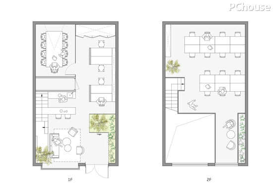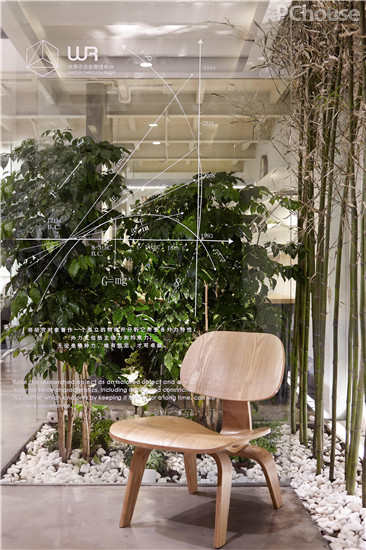 设计说明:1层的独立办公区域被隐藏在植物后,办公区视野尽端为精心营造的室内景观。