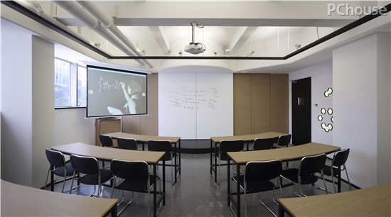 较大的教室兼具了多功能厅的特点,讲台区域为隐藏的“旋转舞台”它连接着多功能室与交流吧两个空间,可共享舞台功能。此区域既可做课堂,又可做座谈、表演室。