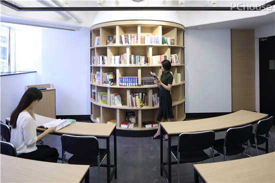 舞台背景的另一面是弧形的书墙,丰富了空间的结构层次,也充实了课堂之后的闲暇时光,并为空间增添一丝文艺气息。