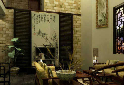 小编的话:这间客厅从家具到电视背景墙一直到窗户装修都以强烈的新中式风格来呈现,电视背景墙以水墨画背景与深棕色百叶窗样式的背景墙来装修,墙面更是以逼真的砖墙壁纸来铺贴,使整间客厅都透出一种浓浓的新中式风情。