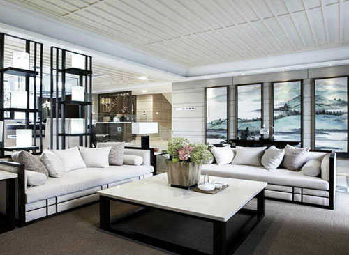 小编的话:黑白两色打造出来的客厅空间,加上墙面上的拼贴山水画幅而显出一种酷酷的新中式风格,以黑色线条勾勒出白色沙发,黑白两色结合的茶几,这些元素都让这个客厅显出一种经典时尚感。