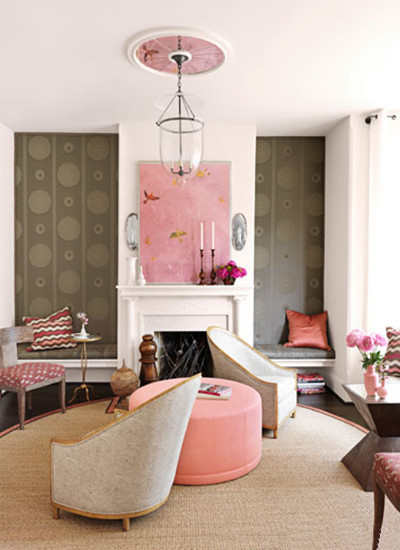 编辑点评:颜色会让你开心,这种强烈的粉色让你心跳加速。粉色俱乐部椅来自Niermann Weeks。托斯卡纳区脚椅来自斯图亚特家具,枕头来自Schumacher's Reflex,墙上的是贝加莫布艺。