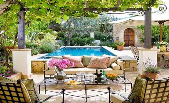 葡萄藤搭建的凉棚清爽阴凉,凉棚下的休息室更是别有一番风味,特别是在湛蓝色的露天泳池的陪衬下。