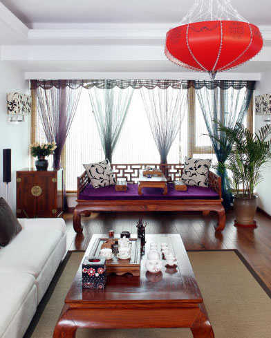 半灯笼造型加水晶吊链火红的灯饰是客厅中最吸引眼球的装饰之一。