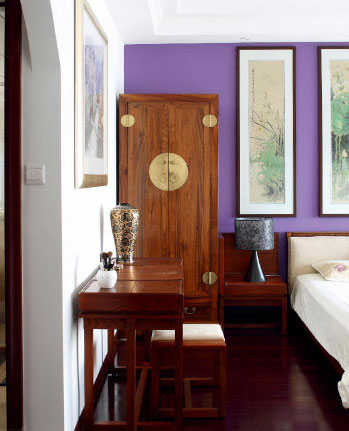 主卧的墙面被刷成了紫色,既与客厅遥相呼应,也凸显了该空间的大气与尊贵。其他的家具也选择了中式风格。明清款的立柜、条案、地柜,在造型和色彩上与双人床无差别,甘当配角,强调的是其功能性。