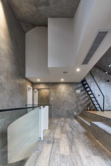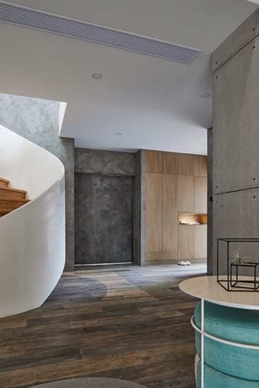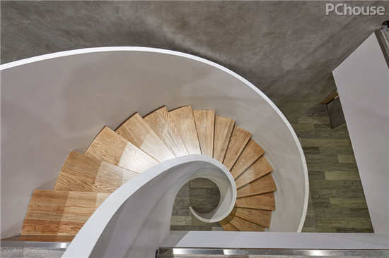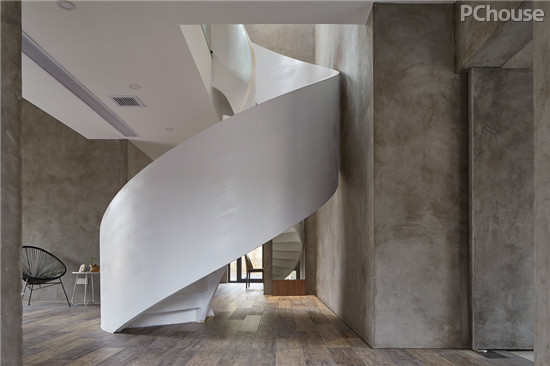 设计说明:功能之外,旋转楼梯在灰色的混凝土空间里显得格外清丽,可以看作是这个空间一件巨大的雕塑作品。