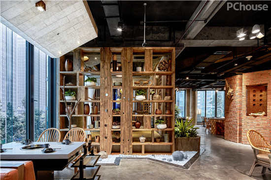 设计说明:条形原木搭建出来的格栅,形成曲折的长廊,并区隔出不同的就餐空间,视线朦胧而通透,与树的肌理完美搭配。