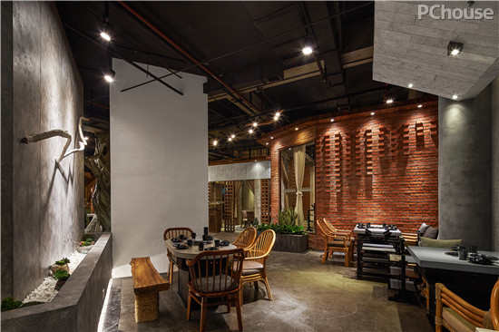 设计说明:空间内用红砖砌出带点工业风格的元素,与水泥和树木一起形成仿似室外的错觉。