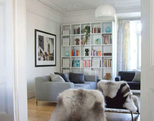 隔壁的会客厅,用深灰色和浅灰色沙发、抱枕相互搭配的方式展现颜色的多层次。在单人座椅加上软绵绵的长毛沙发垫。贴墙矩形书柜,可以收纳书本又可以收纳装饰品,让客厅具备强大收纳功能的同时保持干净整洁。