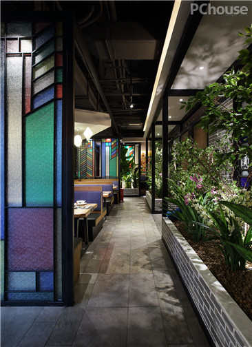 环绕用餐大厅四周的是古制廊式景观花坛,打通室与院的联动感,给人移步异景的庭院既视感,映入眼帘的花草绿植也让人心情盎然。