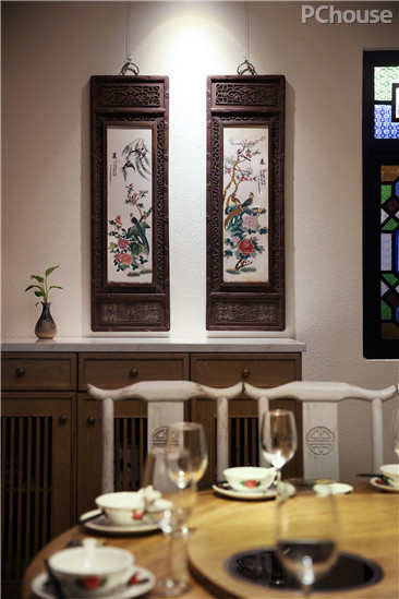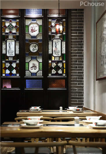 色彩排列不一的西关窗兼具实用和审美功能,文能与花鸟虫鱼小像一道,做一扇靠脸吃饭的墙上挂饰,武则可转动推开,履行它作为窗子的通透义务,在大厅作屏风隔断,在包厢做真实的窗户。