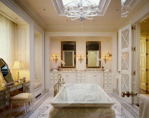 以浴缸为中心对称设计使房间看起来更加大气宽阔,无论是美轮美奂的吊顶还是复古的壁灯都带着浓郁的欧洲皇室风情。