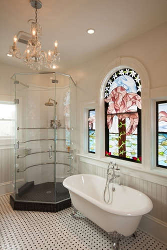 玻璃窗的装饰足以给这件间室创造一番风情,淋浴间的五边形设计简单却独特。