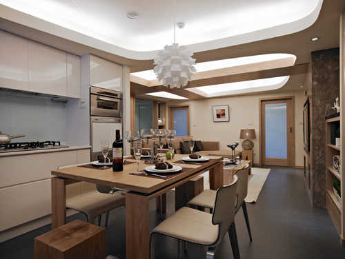 编辑推荐:复合式别墅格局原有的地坪落差,经过阶梯便直接通往餐厅及厨房,一旁石材基座延续使用电视墙的夏木树石,更具整体感。