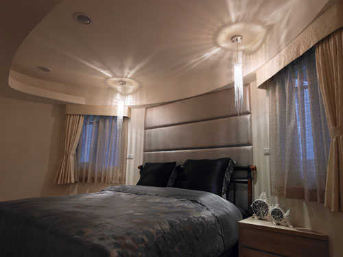 编辑点评:因应特殊的圆弧格局,在床头依然不牺牲装饰及实用功能,如发挥巧思把轨道设计在下方,即便两侧没有支撑也能制成抽屉柜