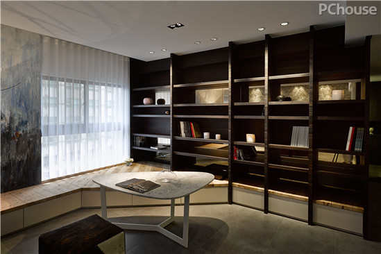 编辑点评:深色的实木书架与泼墨的墙面及飘逸的窗纱形成了鲜明的对比,但却不影响设计个性的表达和整体居室的和谐。反而在无形之中形成一种沉稳的正能量气场,让人可以安心地在这里休憩或者思考。