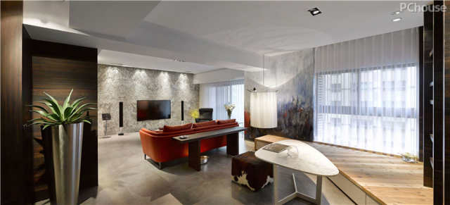编辑点评:无论是粗犷原生态的石面电视墙,还是风情万种的泼墨侧墙,在明亮的射灯下都有着别致的优雅。加上充足的采光和合理的动线规划,公共空间整体呈现着通透与宽敞的舒适感。