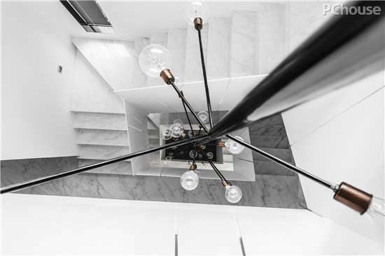 片状鳞片式的造型楼梯及星星般灿烂的垂直吊灯,贯穿且连接各楼层。在空间构建上达到机能区分的同时,跳脱出严谨的几何形体,蕴藉出一份惬意的休闲感觉。