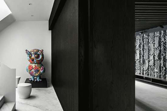负一层为男主人招待好友的接待区,在梯间运用艺术品的陈列,做了一个调性的区分及转变。色彩以灰黑色调为主,质朴的灰与自然光交织,使人放松了身心,大器沉稳之中透露出些许淡淡的禅味。