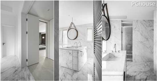 而浴室内部的中岛洗脸台的设计,其实体的BOX规划,使得虚、实的盒体空间概念得以更精准的落实。