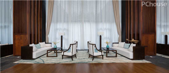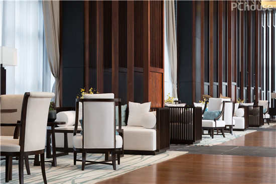 设计说明:当人顺着流畅的行走动线进入另一侧的茶歇休闲区域,长方形的空间拓展像席席拉开的幕布。