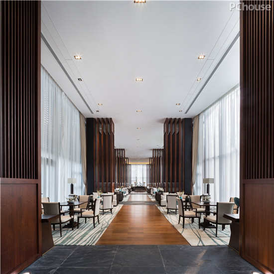 设计说明:从浅木色的地板、新月灰石材,到深木色的超高屏风式的栅栏,无一不选用最接近大自然气息的材料,正如藕色轻盈的荷叶枝条水墨地毯一样,使人放松和享受。