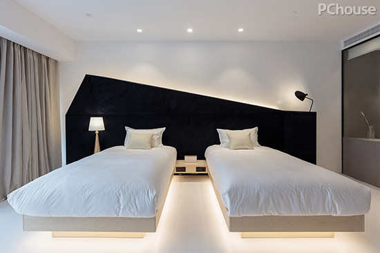 编辑点评:无论是空间在材质上的铺设、变化,还是灯具、家俱的选择,每一个细节都得到了重视。正如床头的动线设计,就是恰到好处的点缀,让素白的空间多了一抹个性的黑,却融入得十分得体和自然,以线条美学提升了整体空间的设计感。