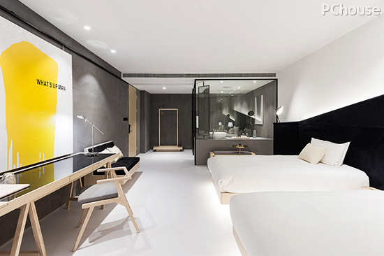 编辑点评:客房的设计则更具亲和力和舒适性,统一而深浅分明的颜色让空间不乏单调的同时也保持了纯粹;玻璃的隔断,模糊着机能区域的界线,不知不觉地放大着空间的视野。在这里,设计师希望用简练的家俱来描绘干净简洁的空间,因此书桌、床的衣架的功能与美学被巧妙结合。