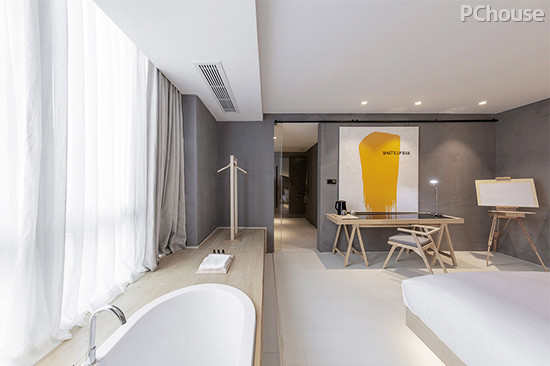 编辑点评:延窗而设的浴缸,是慵懒而随性的最佳代表,为顾客带来别致的入住体验。电视被一幅随意而极具现代气息的挂画作遮挡,画作可以拉动,画作上写着打招呼的语言,贴心而亲切。除此之外,客房里还设有临窗的画架,这是设计师特意为每个客人准备,希望让房间可以沾染上客人独特的印记,也希望每位客人都在入住期间留下珍贵的片刻。
