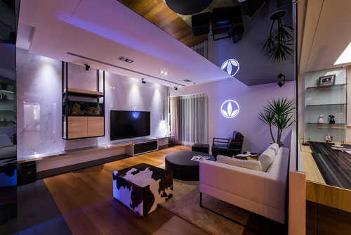 编辑点评:客厅另一边则放置了电视、音响等娱乐设施,黑色的全套款式显得酷劲十足,给人带来视听上的享受。一旁的书橱则是能收纳下不少的书籍与光碟。