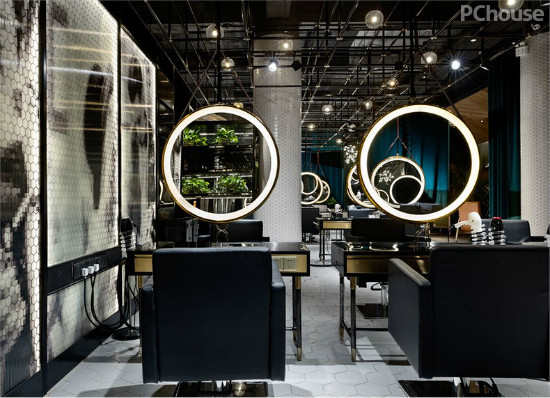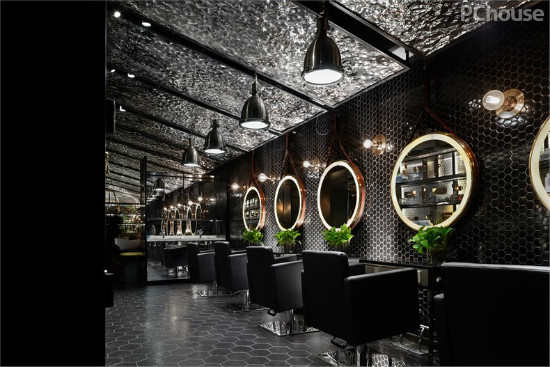 “建构”语汇贯穿整个公共区域,金属构件穿梭游离于公共美发区域,各场域紧密的串联合一,使整个风格显得统一而洗练。在简单利落的空间格局中,仅以不同地坪材质配置作为区分,打造出流畅动线,明亮的剪发区同幽暗的洗发区,利用黑白六角瓷砖马赛克嵌入12星座金属图案纹样加以区分,更加突显功能的各自空间属性及层次,彰显新颖细腻及朋克艺术气息。