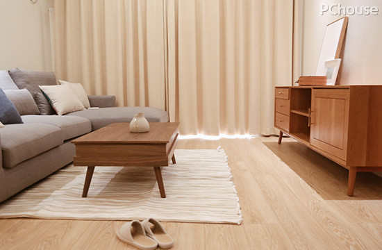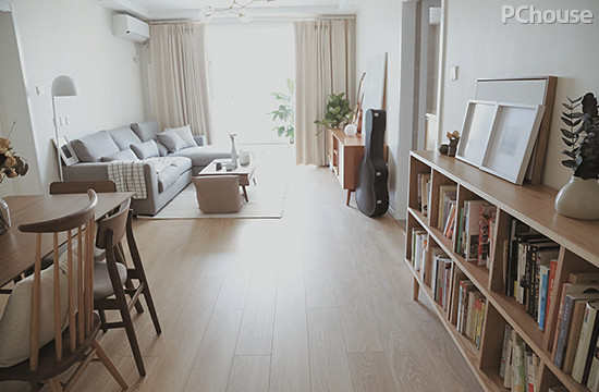 家具刚添置进来的样子,房间还比较空荡,自带wabisabi,客厅的色彩搭配主要以米色,原木色,灰色为主色调大地色。